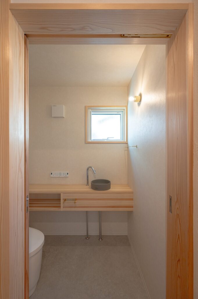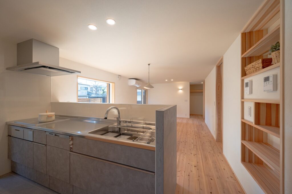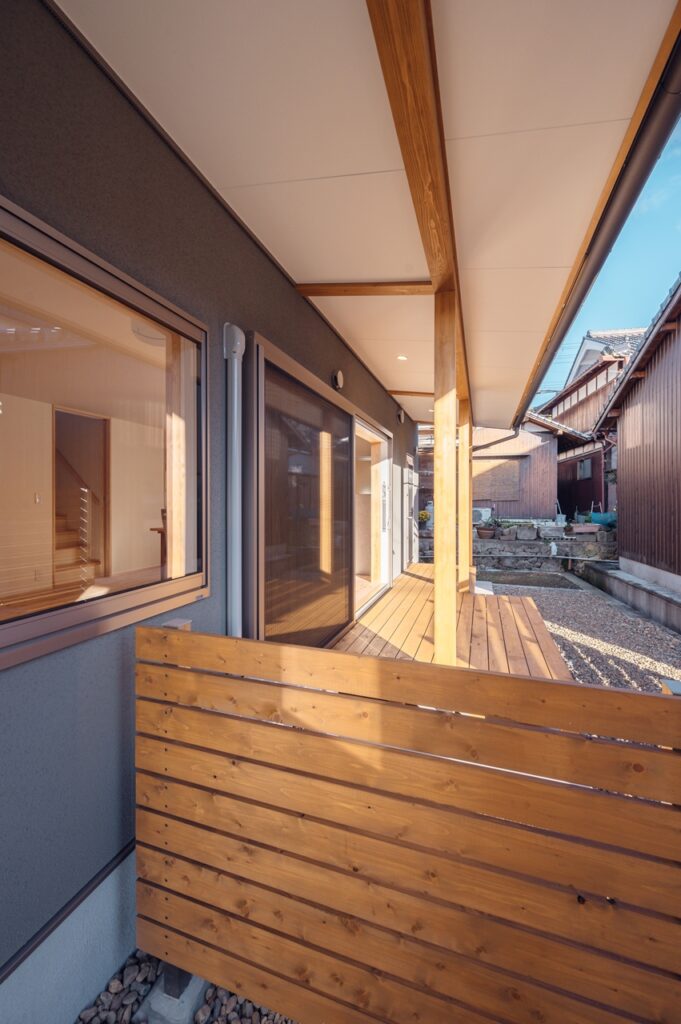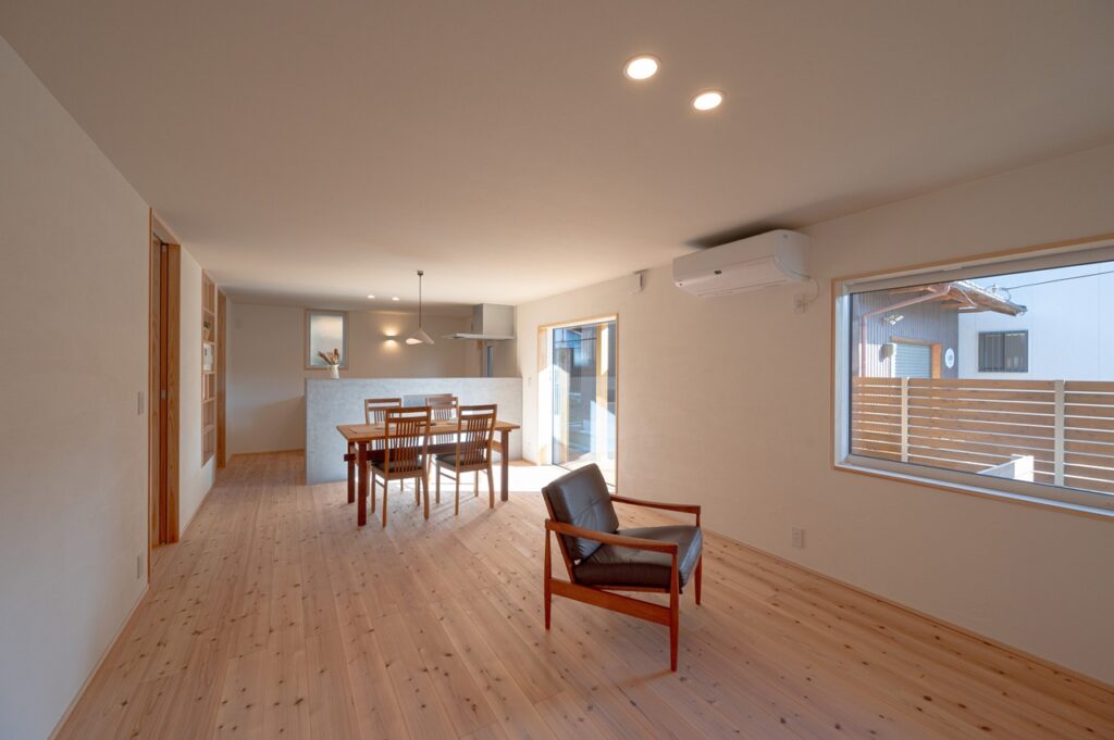 L字型で、周りの視線を感じにくい間取りに設計しました。 平入土間でプライベートな空間から視線をはずし、居心地がよくなるように間取りを工夫しました。